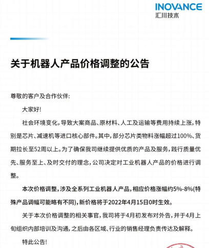 事實上,原材料價格上漲最先影響的是工業機器人上游零部件領域,相關企業也因此早早的發布了漲價通知,國內的匯川技術、禾川科技等,還有國外的ABB、安川電機、施耐德、愛德克、西門子、歐姆龍、艾默生、三菱等一眾工業自動化巨頭企業。