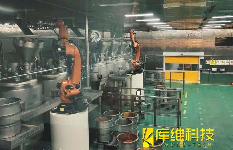反應釜具有精準控溫功能,并在不同的階段調節不同的爐溫,炒好之后,再通過管道輸入包裝車間。而包裝環節仍然由機器人進行操作,