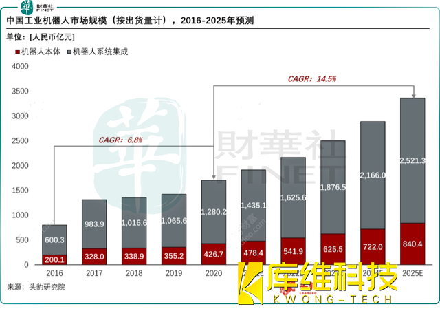工業(yè)機器人是我國智能制造2025的核心抓手之一,是我國機器換人、制造業(yè)產(chǎn)業(yè)升級的核心環(huán)節(jié)。目前看,我國制造業(yè)三化仍處于初級階段,我國工業(yè)機器人中長期看仍具有較大的增長空間。據(jù)頭豹研究院預測,到2025年,中國工業(yè)機器人行業(yè)市場規(guī)模將達到3361.7億元,未來五年的年復合增長率約為14.5%。