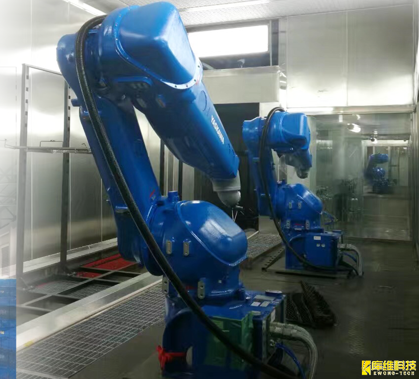 機器人噴涂系統提供一個可以集成于您的噴涂單元內的自動化組件包。噴涂系統包括一個電氣柜、凈化系統,配備模擬量輸入輸出模塊,用于控制噴涂參數如扇形寬度、涂料流量、霧化壓力或電壓和靜電應用的貝爾速度。利用機器人活動自如、任意控制位置、噴涂量和噴涂時間的特點,一副噴頭就能適用于各種模具。采用機器人噴涂,可大量節省離型劑的耗用,省去常規噴涂裝置占據的噴頭擺放空間。