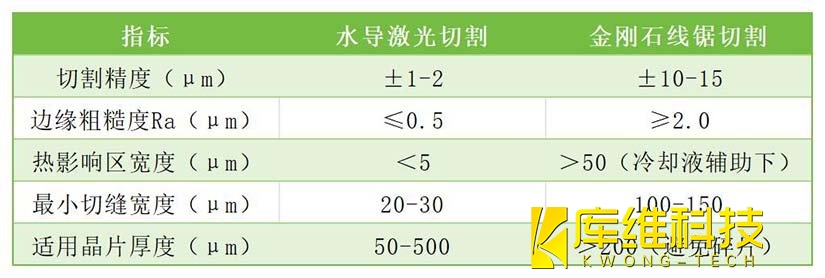 碳化硅(SiC)作為第三代半導體材料的代表,憑借其高硬度、耐高溫、抗輻射等特性,已成為新能源汽車、5G通信、航空航天等領域不可或缺的核心材料。碳化硅的莫氏硬度高達9.5級,傳統切割工藝(如金剛線切割、砂漿線切割)易導致材料熱損傷、邊緣崩裂及高損耗,嚴重制約了其大規模應用。近年來,?水導激光切割技術憑借其獨特的冷卻機制、非接觸式加工特性及高精度優勢,成為碳化硅晶圓切割領域的研究熱點。本文將從技術原理、精度體現及實際應用案例三方面展開分析。